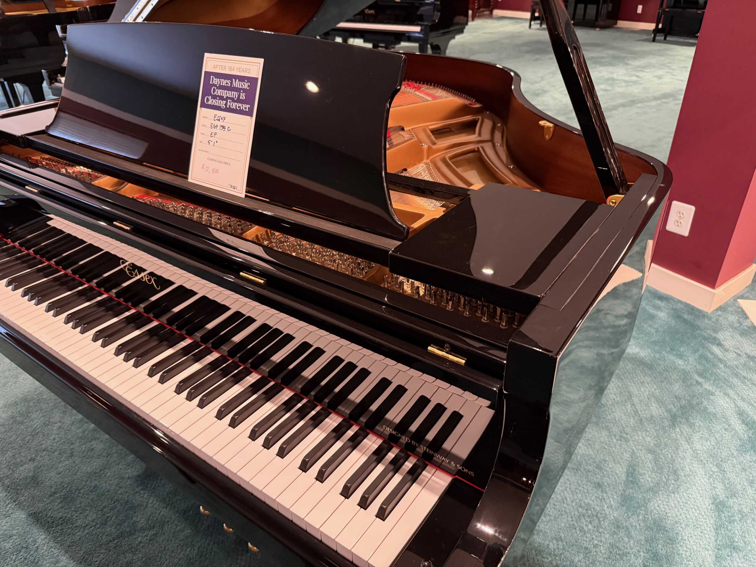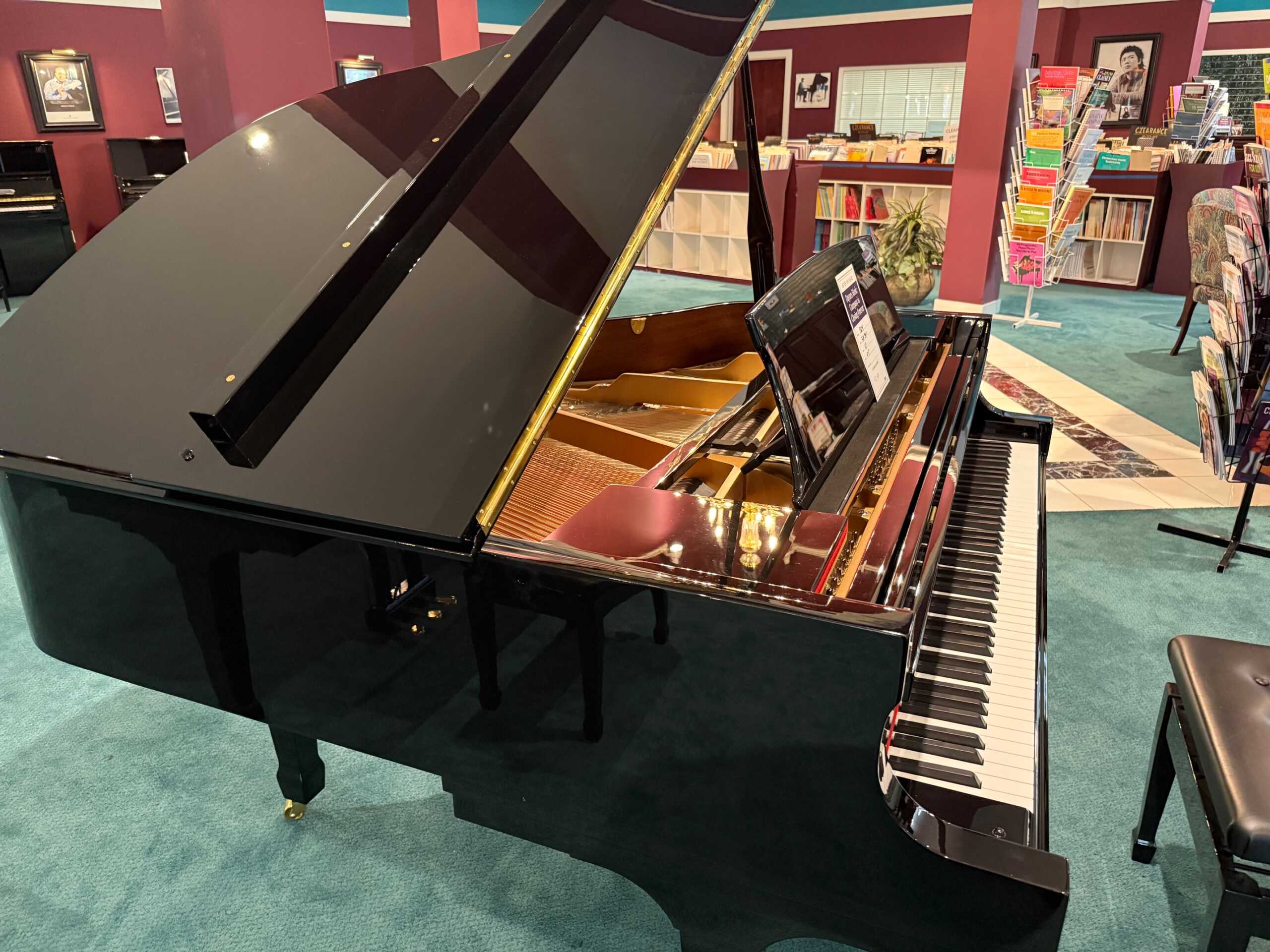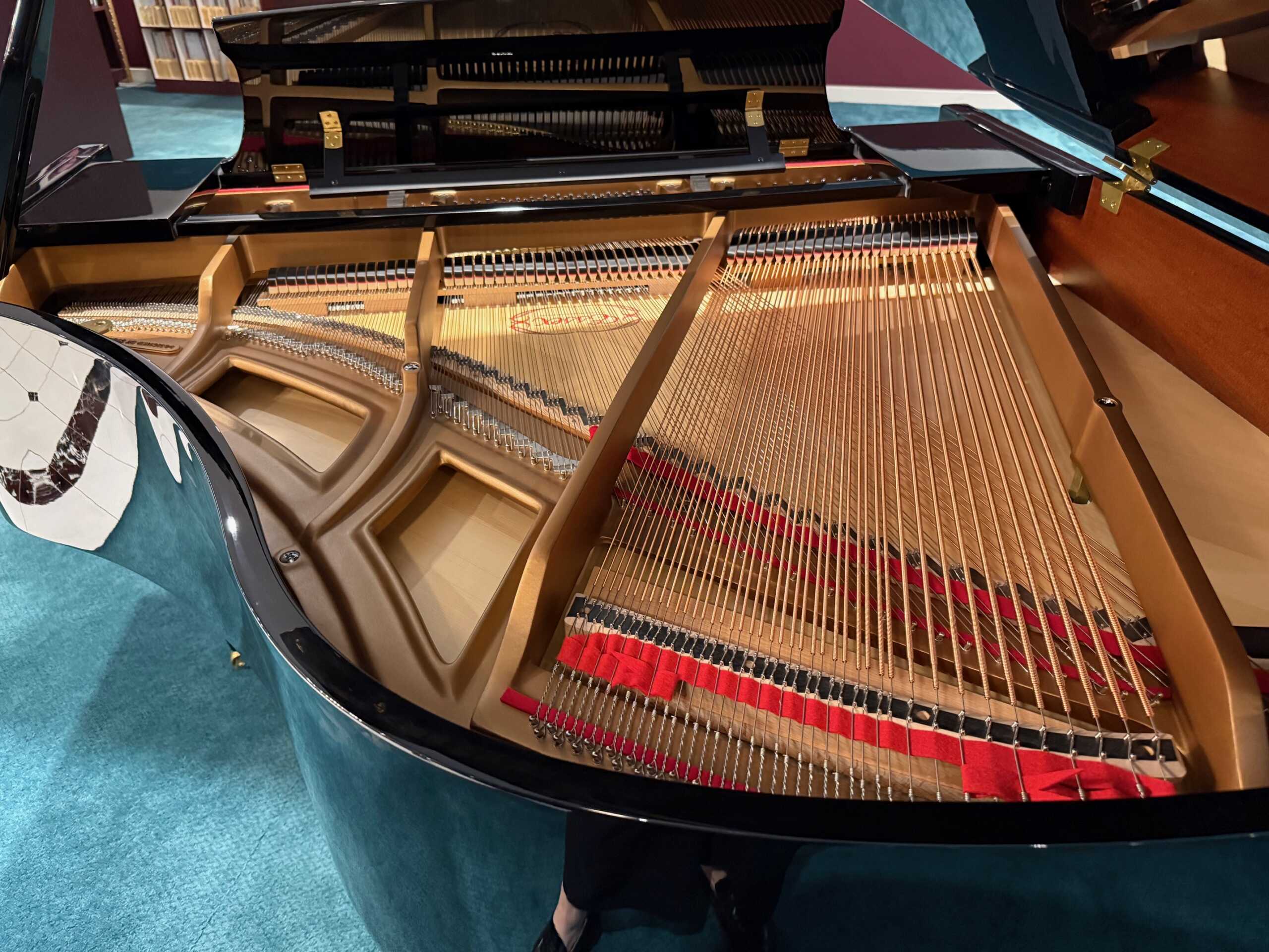This grand piano designed by Steinway & Sons features a solid spruce soundboard that has a tapered profile that is thicker in the treble and thicker in the bass. This creates freer vibration and tonal volume. Brass hardware and slow-fall fallboard.