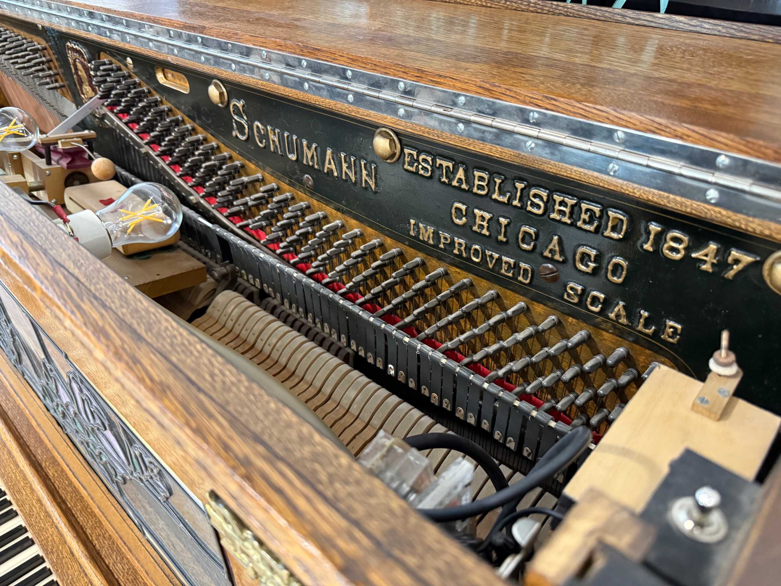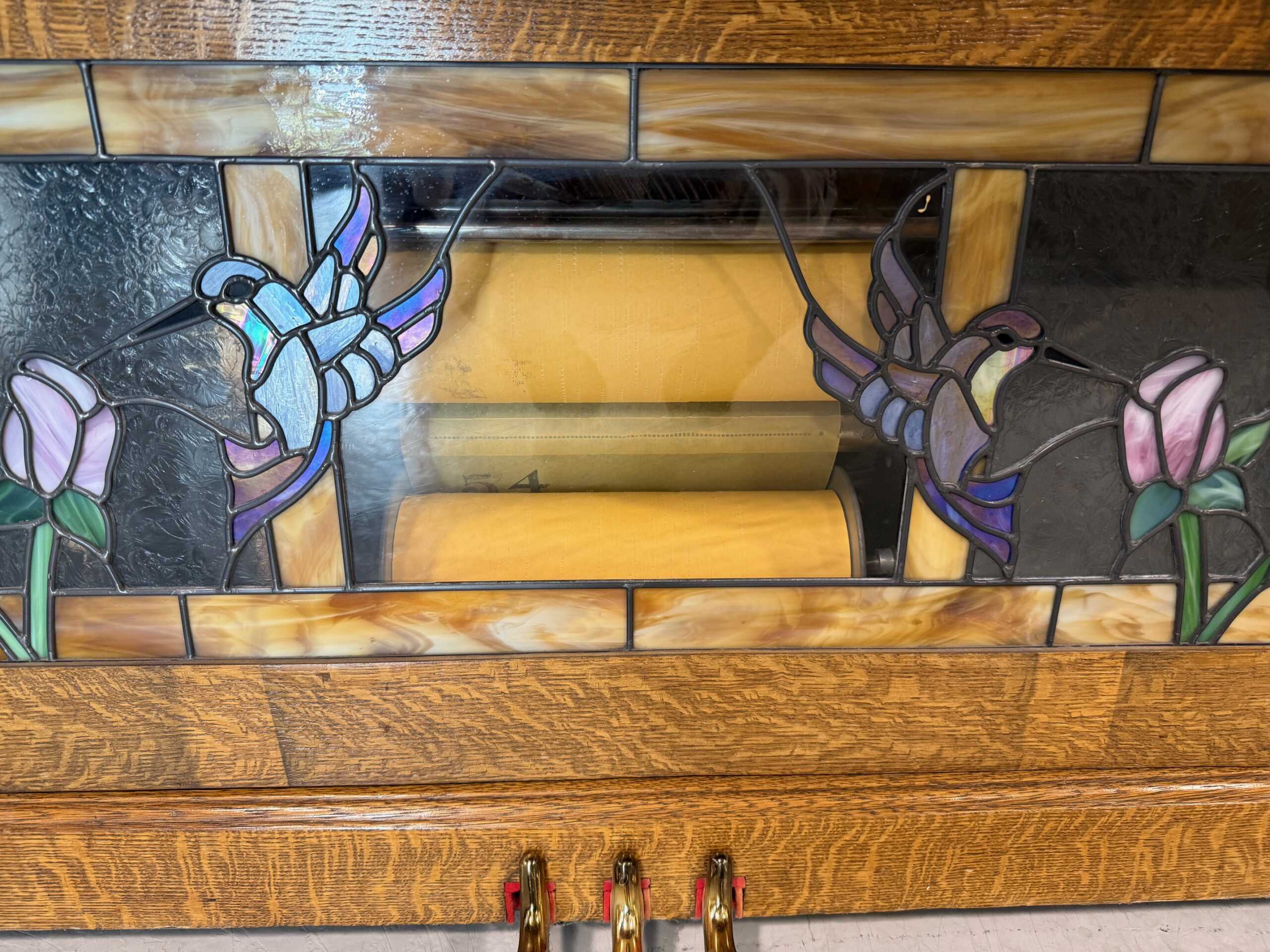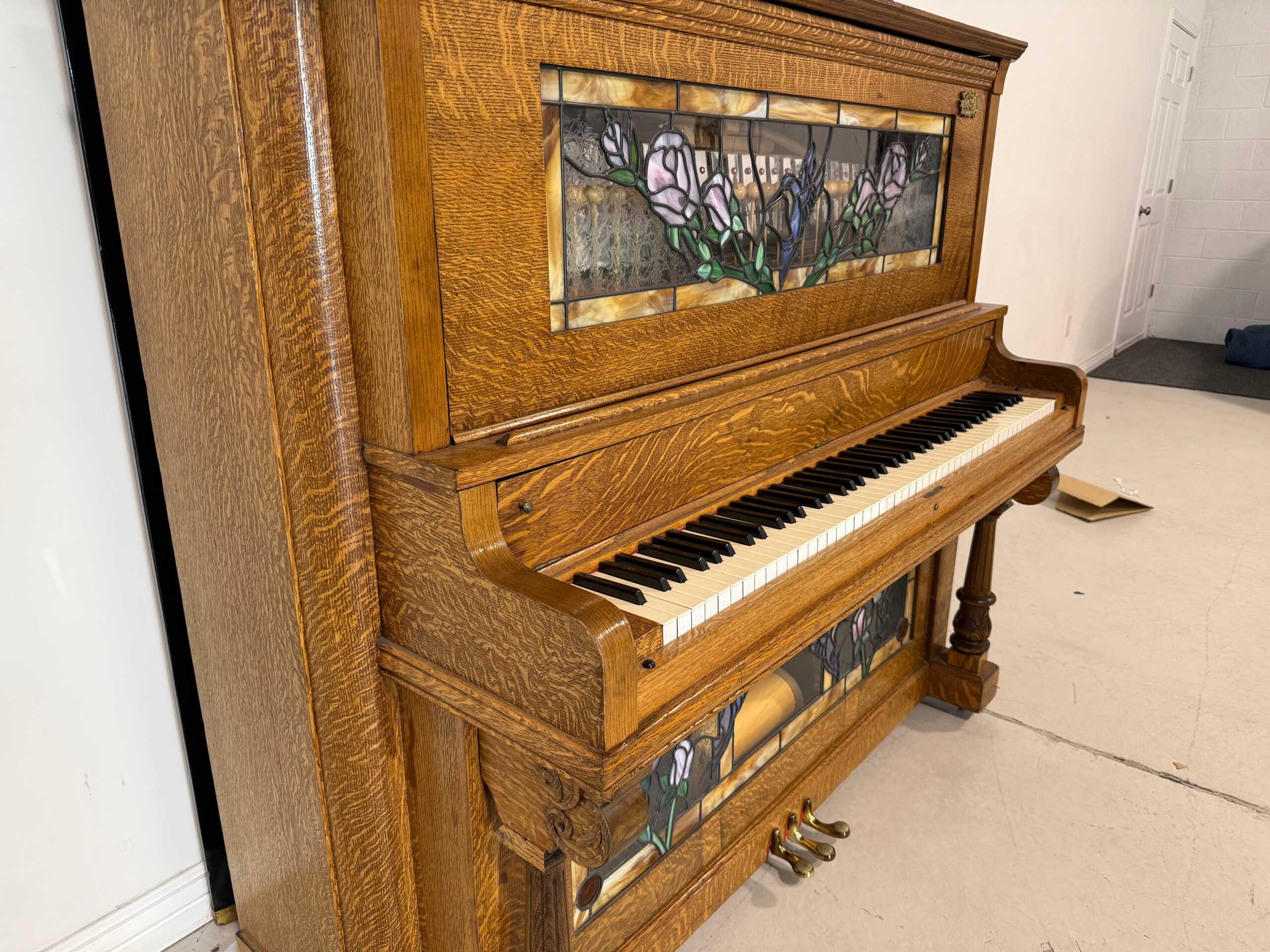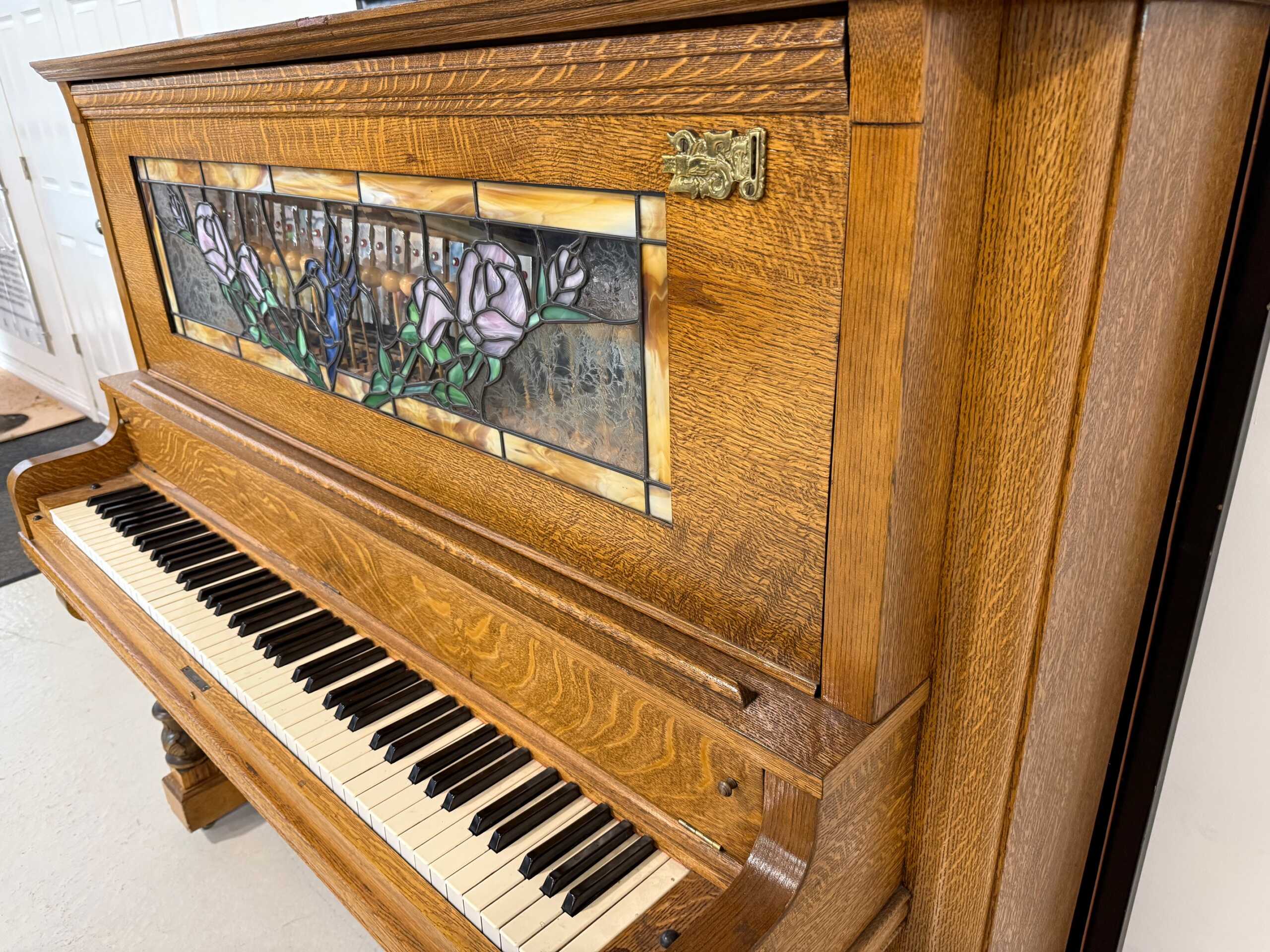 This Schumann upright player piano is complete with a tambourine, drum, glockenspiel, cymbals, wood block, back-lit stained glass and new motor.